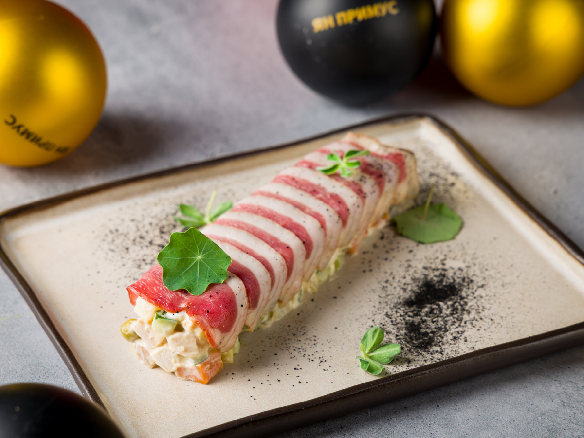 6) На центр тарелки поставьте прямоугольную форму, выложите в нее часть салатной основы Оливье и аккуратно удалите форму. Утиное филе нарежьте очень тонкими слайсами и элегантно разложите их поверх салата.