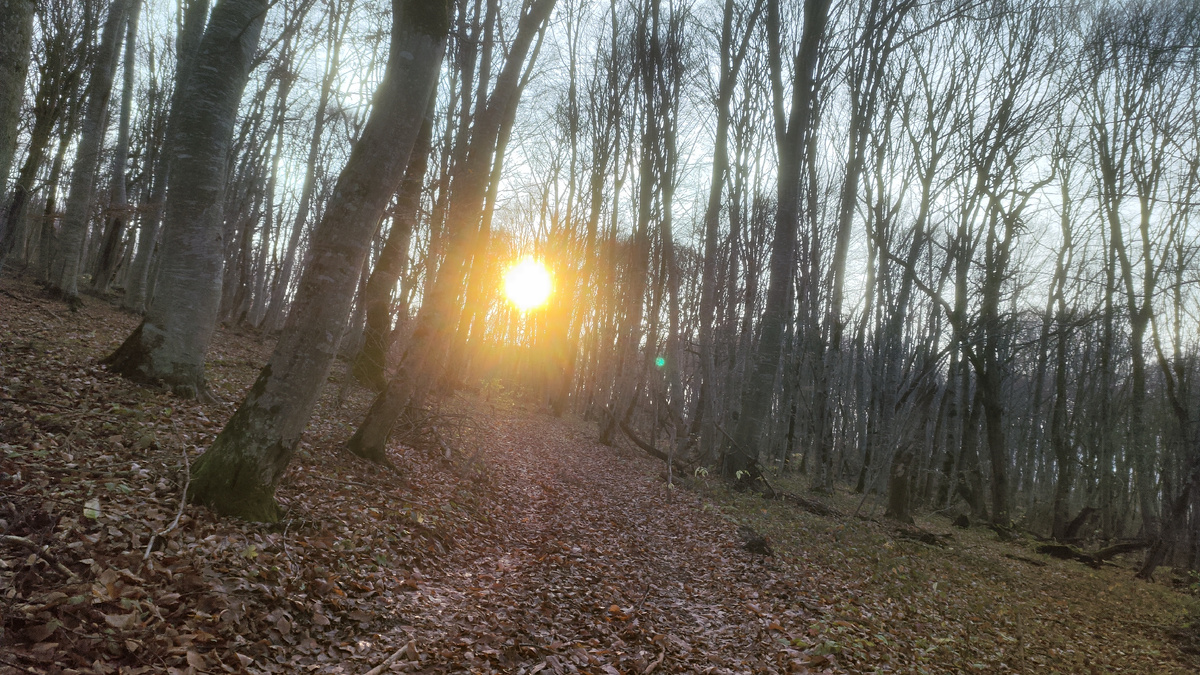 В лесу на дороге было достаточно грязно, благо можно было обойти глубокие лужи и особо грязные участки по лесу. Сейчас, по осени, передвигаться без тропы было не то что возможно, а достаточно приятно. Первая часть пути шла вдоль балки Злобина, затем балка осталась позади, а подъём стал более крутым, тем не менее приятным, без лишнего напряжения. Лес уже практически полностью облетел, и только редкие яркие пятна выделяли хвойные и особо стойкие лиственные деревья. В некоторых местах присутствовали следы свежих срубов и распилов. Листва уже не скрывала окружающих хребтов, и очередной раз делаю акцент на то, что в межсезон ходить по горам куда более интересно, чем летом, когда ты просто идёшь среди леса и ничего вокруг не видишь. Сейчас же всё- всё вокруг, все окрестности, все холмы, хребты и горы сквозь лес были видны.