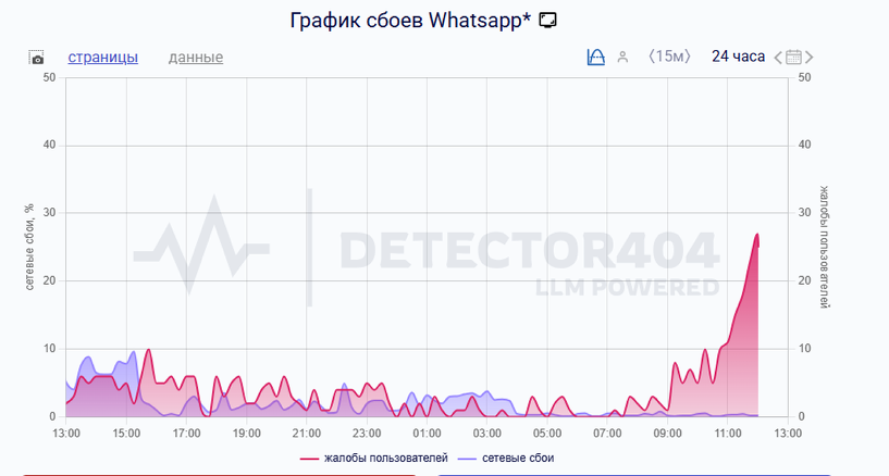Пользователи массово жалуются на сбой в работе WhatsApp*. Наши читатели сообщают, что их сообщения не доходят или отправляются с задержкой. Не грузятся фото/видео как в мобильной, так и десктопной версии. Согласно сайту DownDetector, количество жалоб начало расти с 09:00. На этой неделе член комитета Госдумы по информполитике Антон Немкин заявлял, что блокировка WhatsApp — «вопрос времени». По его словам, регулярные сбои в работе американского мессенджера показывают, что «зарубежные площадки ведут себя как хотят» с российскими пользователями. При этом в октябре Роскомнадзор сам подтвердил, что принимал «меры по частичному ограничению работы иностранных мессенджеров». Главная новость по теме * принадлежит Meta, которая признана экстремистской и запрещена в России