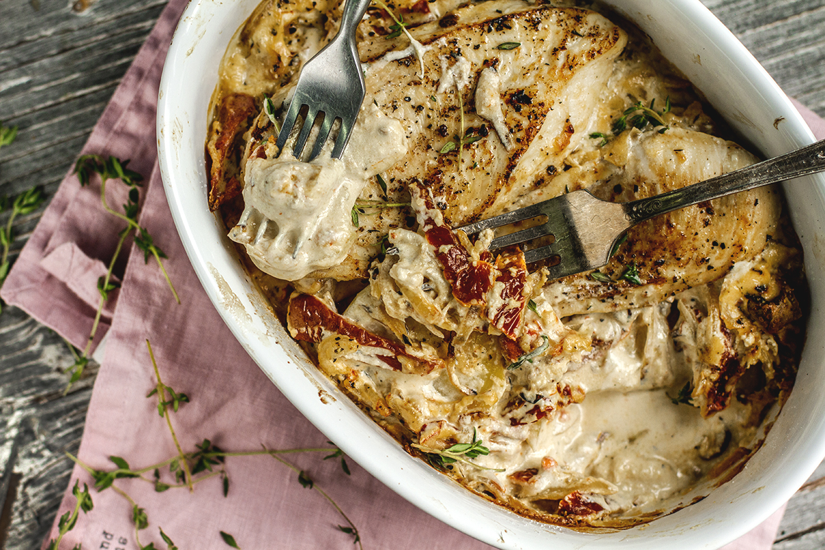 9. Влейте сливки, добавьте тимьян и прогревайте 1-2 минуты до загустения.
