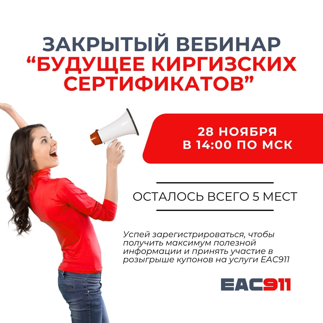 🚨 Уже сегодня состоится вебинар, который вы так ждали! Сегодня 28 ноября, и в 14:00 по МСК стартует наш закрытый вебинар «Будущее киргизских сертификатов». Интерес к теме оказался очень высоким. Места разобрали быстро, поэтому для подписчиков канала мы открыли ещё 5 слотов. У вас есть несколько часов, чтобы успеть присоединиться. 🎁 Среди всех участников мы разыграем ПОДАРОЧНЫЕ СЕРТИФИКАТЫ ЕАС911 на суммы от 10 до 100 тыс. руб. 👉 ЗАБРОНИРОВАТЬ МЕСТО Увидимся на эфире в 14:00! ✅ Канал | Сайт | Поддержка