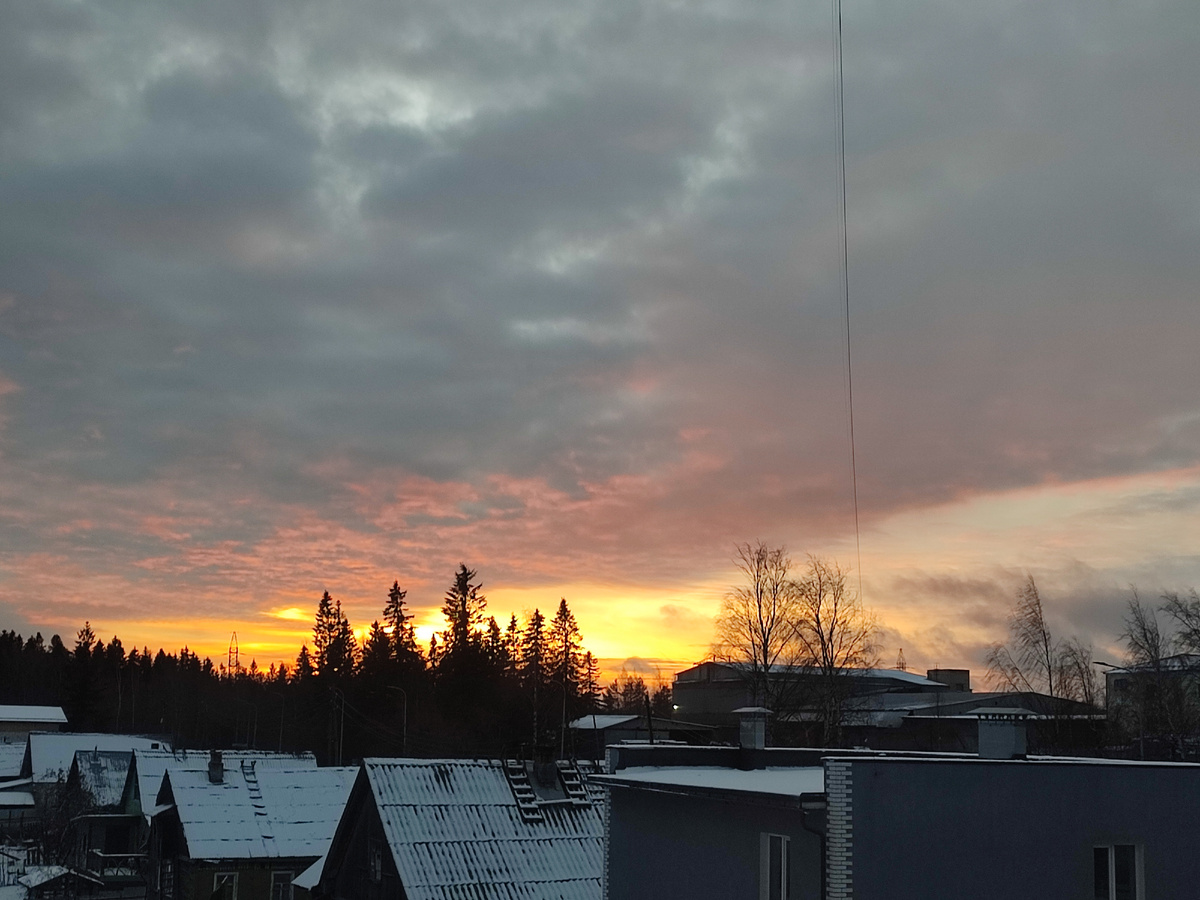 Пятница. 28.11.25. Утро солнечное и очень ветренное. В девять утра показали красивый восход солнца. Он перемещается всё правее. Летом солнышко вставало над озером. Теперь где-то за лесом. Полчаса и картинка меняется. Вчера вечером поставила монтироваться субботнее видео. По времени понимала, что процесс завершится глубокой ночью и спокойно легла спать. Среди ночи проснулась от звука собственного голоса. Вскакиваю и перед глазами вижу такую картину. На столике стоит открытый ноутбук, на клавиатуре ровно по центру сидит Сардельковна и ее этот момент ничуть не смущает. Скажу больше, подход к ноутбуку был забаррикадирован, потому, что я предвидела, что пушистый монтажёр может нагрянуть с проверкой. Мало того, что она села на клавиатуру, она удачно нажала на какую-то клавишу и запустила в видеоплеере смонтированное видео. Сама уходить не хотела, пришлось брать на руки и слушать недовольное нытьё. Несмотря на боевой характер, попадая на руки, Сардельковна начинает жалобно пищать и ощущение,