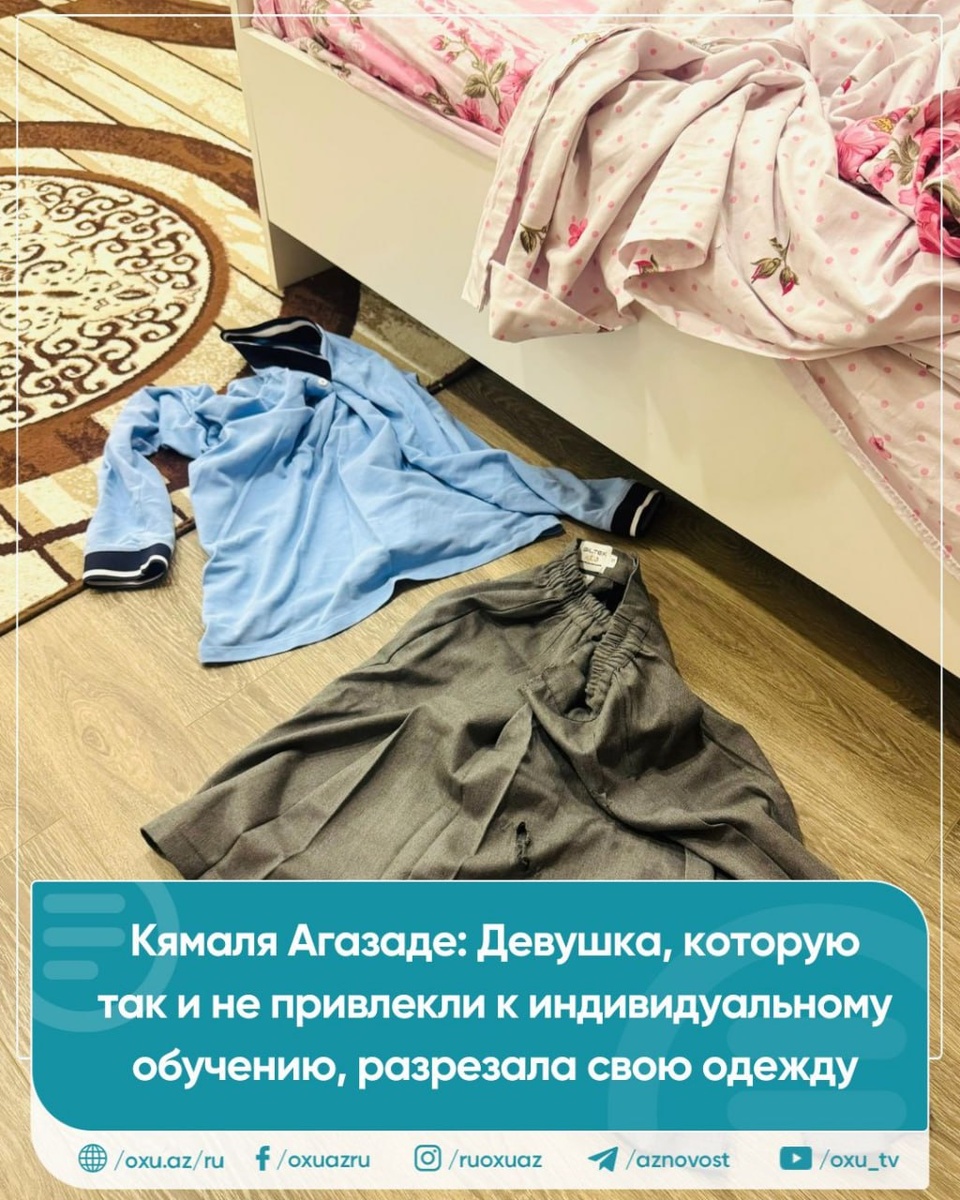 💬 Кямаля Агазаде: Девушка, которую так и не привлекли к индивидуальному обучению, разрезала свою одежду. Девушка, проживающая в приюте, впала в депрессию и разрезала свою одежду, потому что её не подключили к индивидуальному обучению. Oб этом на своей странице в социальной сети написала руководитель приюта Союза детей Азербайджана Кямаля Агазаде. "14 ноября я опубликовала статус о трёх наших воспитанницах, которые должны были перейти на индивидуальное обучение. 17 ноября в спешке сообщили, что они начнут ходить уже с понедельника. Каждый день она с вечера готовила одежду и ждала от нас ответа. А ответ был один: "Давайте подождём". Вот и получите ответ! Наша 16-летняя девочка, которая должна была обучаться индивидуально в третьем классе, больше не пойдёт. Она уже в депрессивном состоянии. Разрезала свою одежду", - говорится в публикации. По этому поводу в Государственное агентство по дошкольному и общему образованию Азербайджана направлен запрос. #ruoxuaz #КямаляАгазаде #Союздет