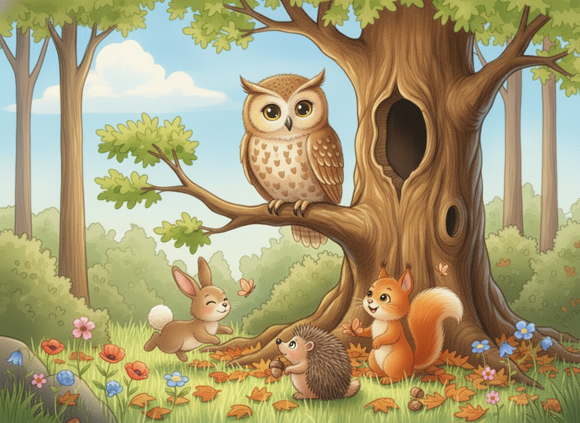 Добрая сказка для детей про совёнка, которая не любила учиться. Поучительная история о ценности знаний, дружбе и помощи близким. Сказка на ночь для малышей, которая учит ответственности и внимательному отношению к окружающим. В тенистом лесу, в уютном дупле старого дуба, живёт мудрая сова по имени Фиона. Все зверята знают: если нужен добрый совет, если поссорился с другом или просто на душе тревожно — нужно бежать к Фионе. Она всегда выслушает, поймёт и подскажет, как поступить. Её уважают за спокойствие, доброту и невероятную мудрость. Но так было не всегда. Когда-то Фиона была маленькой и непоседливой и больше всего на свете не любила учиться. На уроках в Лесной школе она часто витала в облаках, мечтая о приключениях, и не слушала мудрую сову Злату. «Зачем мне знать, какие ягоды съедобные? Или как по звёздам найти дорогу? Это так скучно! — думала она. — Гораздо веселее играть в догонялки с зайчатами!» Её лучший друг, Зайчонок Пуфик, думал точно так же. Вместо уроков они веселились