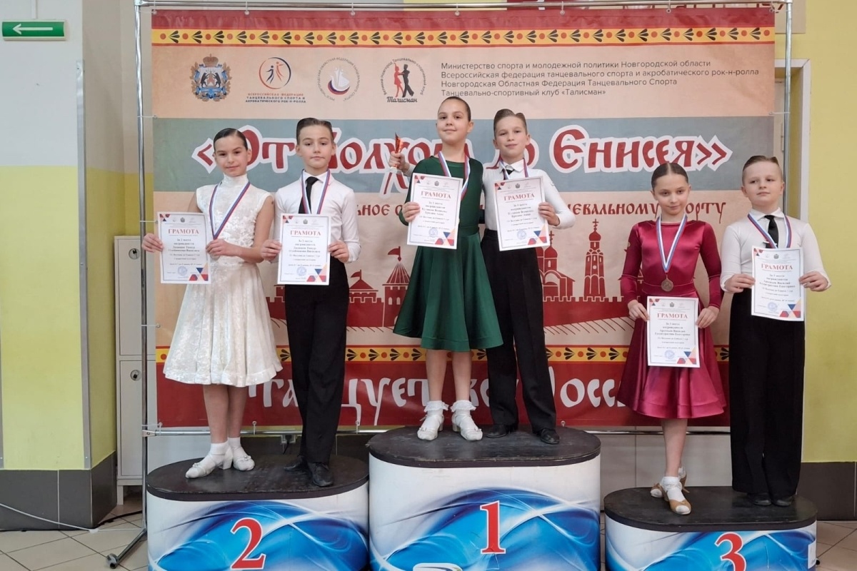 В их числе – одна золотая, шесть серебряных и пять бронзовых наград. В Великом Новгороде прошел открытый региональный турнир по танцевальному спорту «От Волхова до Енисея». За награды соперничали дуэты и солисты разного возраста и класса мастерства из пяти субъектов РФ. Конкуренцию хозяевам составили танцоры Санкт-Петербурга, Ленинградской, Псковской и Тверской областей. Федерацию танцевального спорта Тверской области представляли воспитанники клубов Торжка и Вышнего Волочка. По итогам всех выступлений наши земляки собрали коллекцию из 12 медалей, в их числе одна золотая, шесть серебряных и пять бронзовых. Среди пар дважды на пьедестал почета поднялись Тимур Дадашов и Василиса Олейникова. Воспитанники клуба «Фьюжн» (Вышний Волочек) добились призового успеха в категории «Дети-2+1» среди дуэтов до D-класса мастерства. По европейской программе танцев волочане заняли второе место, по латиноамериканской программе стали бронзовыми призерами. Среди солисток наибольшего успеха добилась Кристин