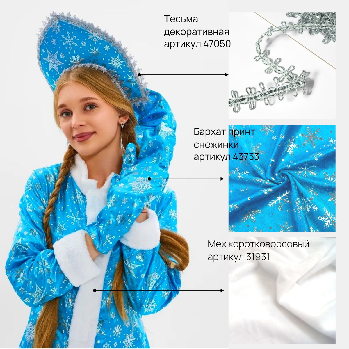 🎄✨️ Шьём костюм Снегурочки вместе с Белой Розой! ✨ Хотите создать волшебный новогодний образ своими руками? У нас есть всё, что нужно для идеального костюма Снегурочки! ❄️ Основная ткань — бархат принт «Снежинки» • Артикул 43733 • Состав: 100% полиэстер • Ширина: 160 см 💰 Цена: 749 ₽ ❄️ Мех коротковорсовый для отделки • Артикул 31931 • Состав: 100% полиэстер 💰 Цена: 245 ₽ ❄️ Декоративная тесьма серебро 18 мм • Артикул 47050 💰 Цена: 45 ₽/м Приходите в «Белую Розу» — поможем подобрать всё до мелочей и расскажем, сколько ткани нужно именно под ваш размер✨❄️ Готовим новогоднюю магию своими руками! 🎁✨