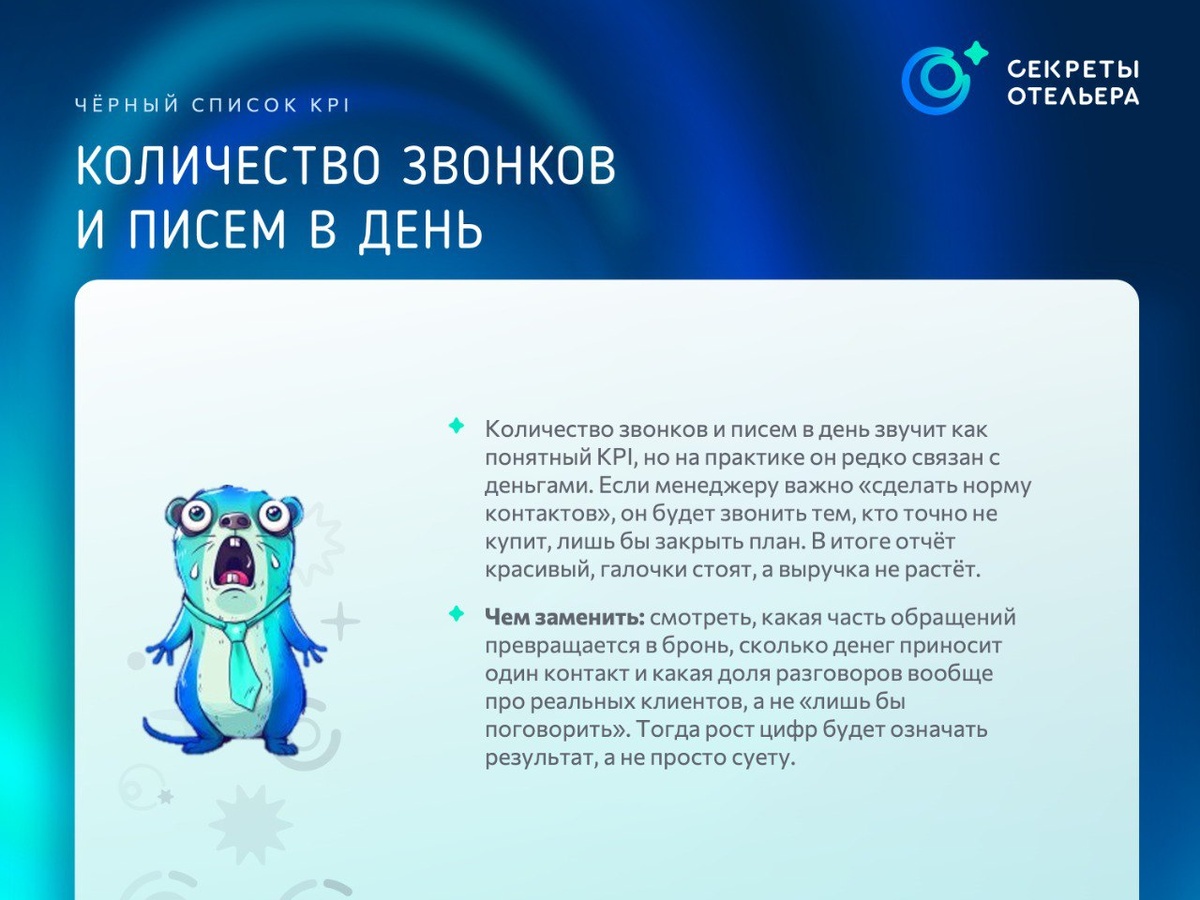 Чёрный список KPI, которые не делают отель богаче Сегодня поговорим о KPI. Тех самых, ради которых рисуют цветные таблицы, спорят на планёрках и иногда радуются сильнее, чем отчёту по выручке. В каждом отеле есть своя священная таблица показателей. Где-то её печатают и вешают в кабинет директора, где-то показывают раз в квартал на общем собрании. Проблема в том, что часть этих KPI прекрасно смотрится в отчётах, но почти никак не связана ни с деньгами, ни с гостем. Мы собрали, на наш взгляд, самые «любимые» KPI - те, которые отлично имитируют жёсткий контроль, но слабо помогают зарабатывать и улучшать сервис. Это подборка показателей, которые как минимум стоит пересмотреть и задать им пару неприятных вопросов. Если по ходу чтения узнаете свои - можете мысленно поставить им жёлтую карточку.