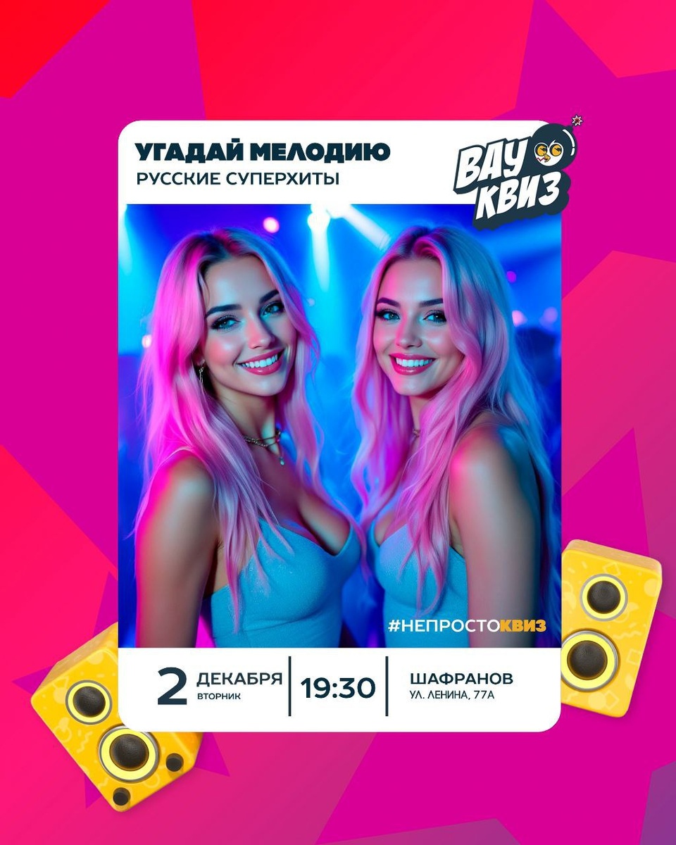 Угадай мелодию Русские супер хиты на квизе В этот день организаторы собирают всех, для кого русская музыка — это не просто фон, а настоящая история со своим саундтреком. Вас ждут «Белые розы», «Экспонат», «Грустный дэнс» и «Владимирский централ». Предлагают начать с лихих девяностых, прорваться через нулевые, зарядится энергией десятых. А еще вернутся в прошлое с «Гостями из будущего», зажечь под современные хиты и зафиналить этот коктейль мэшапами 🕐2 декабря, 19:30 📍Шафраноф, Ленина 77а 🪙500 рублей 🔑 зарегистрировать команду можно на сайте или по номеру телефона +79144903060 #Новости Предложить публикацию:@zabkulisye_bot