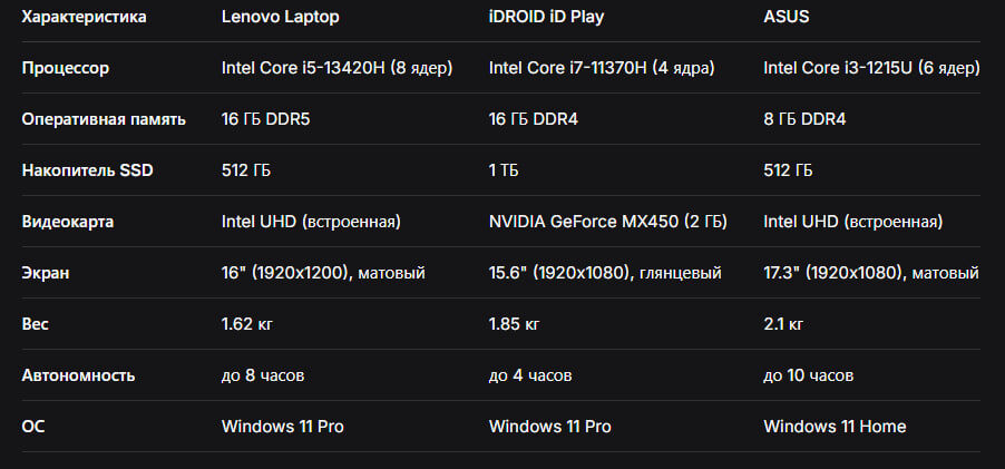 Приветствую, дорогой читатель! Выбор ноутбука сегодня — задача не из лёгких. Производители завалили нас сотнями моделей с кучей характеристик, в которых легко утонуть. Давайте отбросим маркетинг и разберём три интересных ноутбука от Lenovo, iDROID и ASUS по косточкам. У каждого свой характер, свои сильные и слабые стороны. Готовы? Поехали! Чтобы было наглядно, сведём всё по полочкам в таблице. А теперь — детальный разбор. Сильные стороны: Слабые стороны: Кому подойдёт?