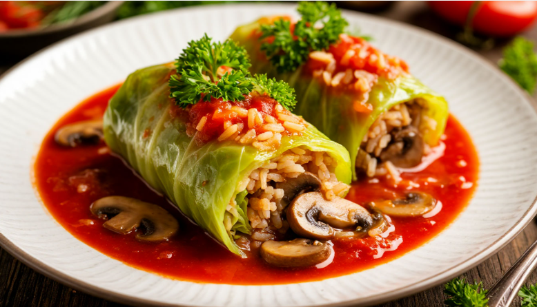 Блюдо дня: Голубцы с рисом и грибами в томатной подливе.