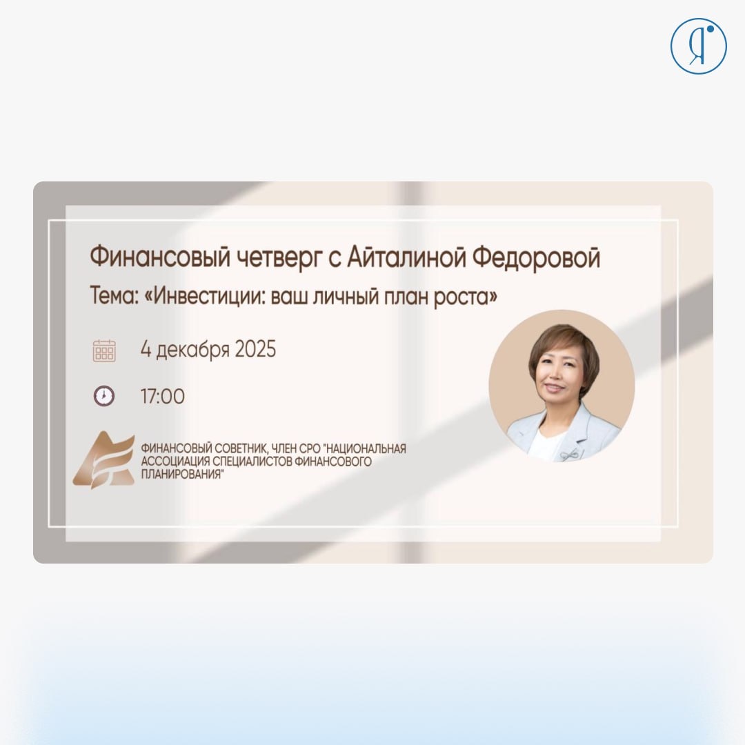 Финансовый четверг с Айталиной Федоровой #МК Тема встречи: «Инвестиции: ваш личный план роста». Вы узнаете: - как выбрать надёжные финансовые возможности, - разобраться в налогообложении, - построить долгосрочный план роста капитала. Спикер: Айталина Федорова - практикующий финансовый советник, эксперт с 18‑летним опытом работы. 4 декабря | 17:00 Национальная библиотека РС (Я), Ленина, 40 Вход свободный, строго по записи +7 4112 455 855 Online Якутия | Ждем вас в МАХ