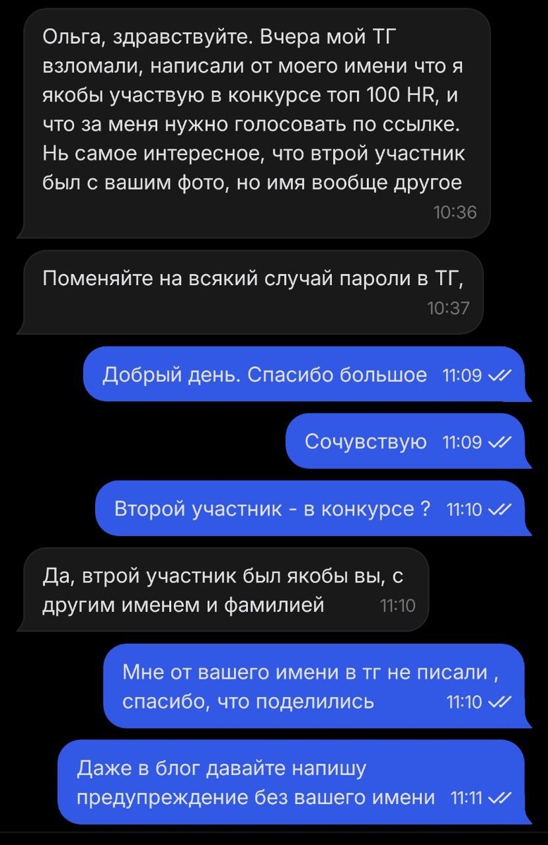 Коллеги, делюсь диалогом с любимым клиентом, HRD. Она мне написала сегодня. Сейчас идет конкурс ТОП HR, НЕ голосуйте ни по каким ссылкам. Я в этом конкурсе - НЕ участвую И поменяйте пароли в ТГ свои на всякий случай ❤️ Ваша Ольга Полднер 🔥 @Olgapoldner