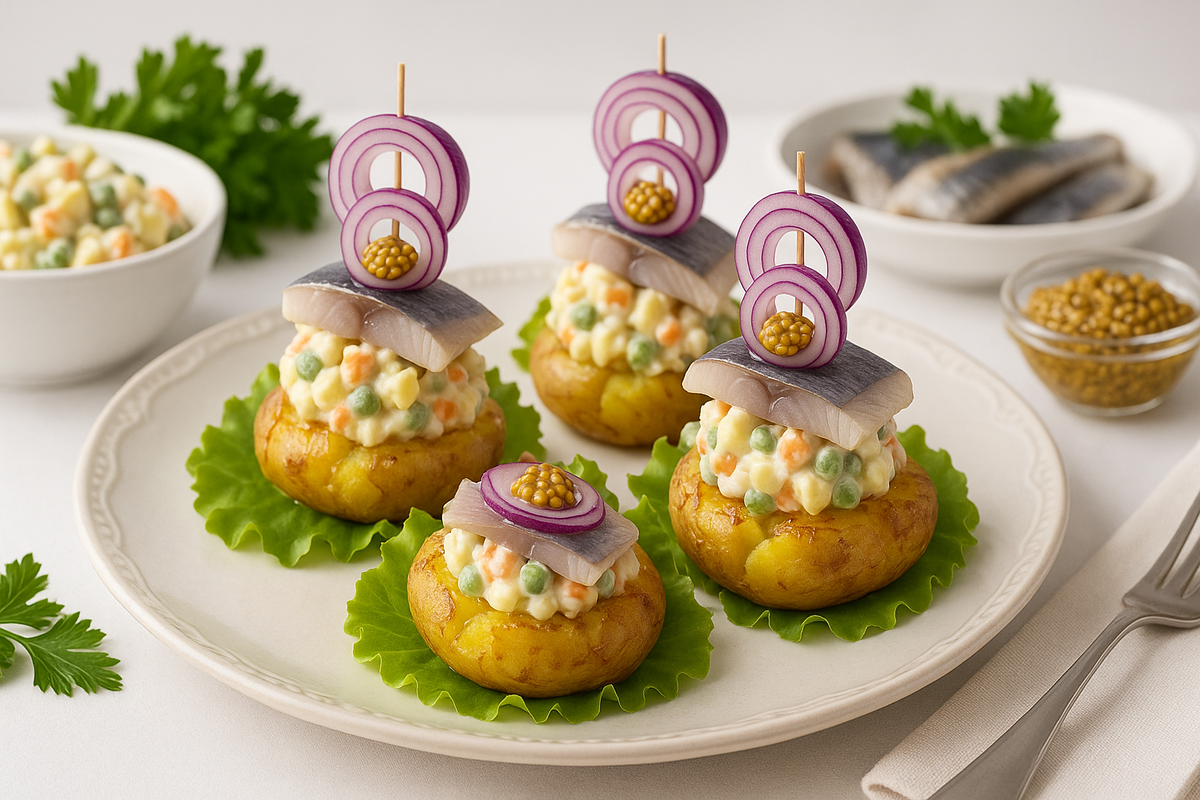 Молодой картофель запекается в форме для маффинов до мягкости, а потом каждый клубень аккуратно продавливается рюмкой чтобы он треснул и внутри появилась выемка. Чуть соли, капля постного масла и ещё несколько минут в духовке. Корочка становится тонкой и хрустящей, аромат плотный, тёплый. В этот момент хочется съесть сразу, но мы идём дальше. На горячую картошку кладём ровную ложку салата Оливье именно он даёт нежность и контраст текстур. Далее на шпажке фиксируем небольшой кусочек селёдки и три тонких кольца маринованного красного лука. Между селёдкой и луком пол ложечки дижонской горчицы она собирает вкус в точку. Получается почти канапе, но на картофельной основе. Есть удобно руками, вкус сложный, праздничный, будто придуманный шефом. Ингредиенты Картофель молодой 6 шт Салат Оливье 6 ч л Селёдка слабосоленая 120 г Маринованный красный лук по вкусу Горчица дижонская 1 ч л Постное масло, соль Приготовление КБЖУ на 100 г Белки 7,5 г Жиры 6,1 г Углеводы 13,8 г Советы • Для Оливье лу