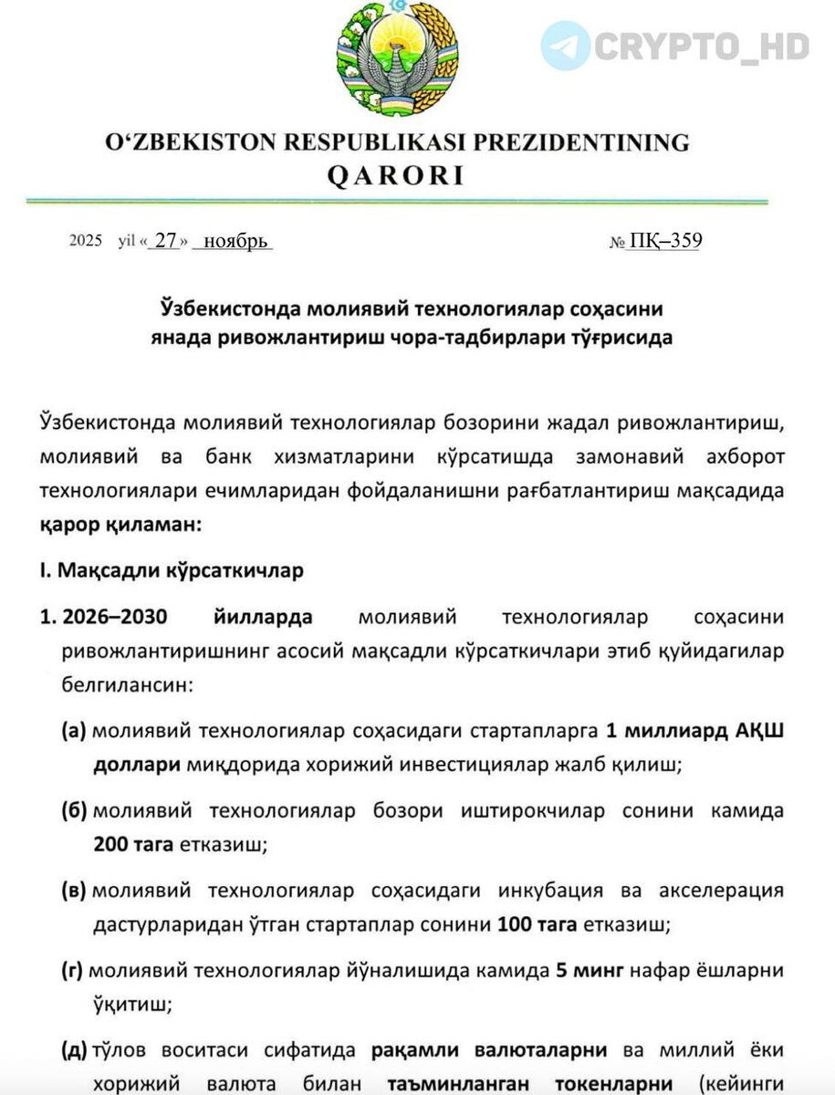 🔥🇺🇿 В Узбекистане начнут использовать стейблкоины как средство платежа – kun.uz ➥ С 1 января 2026 года в стране начнет действовать специальный правовой режим, регулирующий обращение стейблкоинов как платежного средства. ➥ В рамках режима реализуют пилотные проекты по созданию платежной системы на технологии распределенного реестра, а также сформируют рынок токенизированных акций и облигаций. ➥ С этого же срока юридическим лицам разрешат выпуск токенизированных ценных бумаг, а на фондовых биржах создадут отдельную площадку для их обращения. Ранее: - токен HUMO - Binance в Узбекистане Crypto Headlines