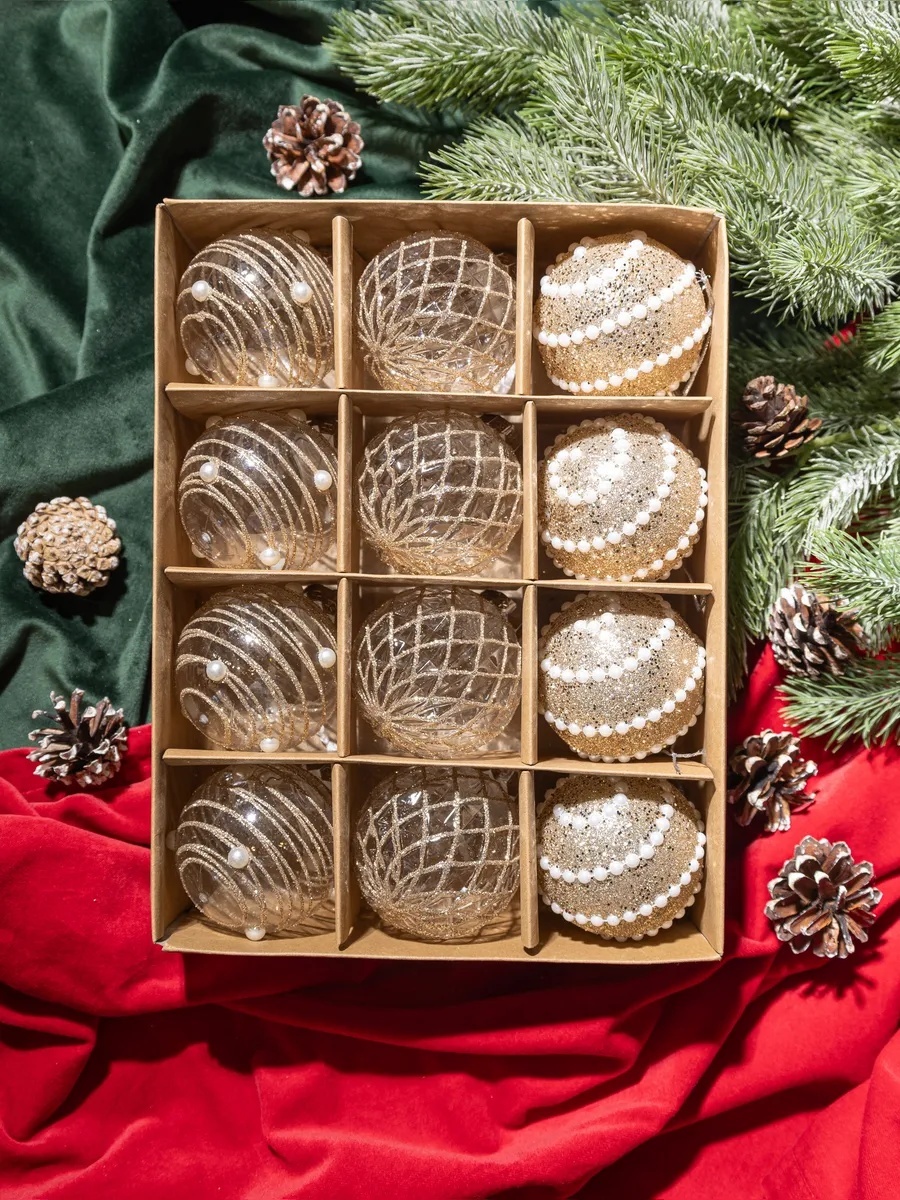 Этот набор из двенадцати шаров диаметром 7 см — готовое решение для создания гармоничного образа вашей ёлки. Разнообразие узоров и фактур позволяет комбинировать их между собой, создавая сложные и интересные композиции. Прозрачные шарики с блёстками особенно эффектно смотрятся в свете гирлянд, создавая иллюзию искрящегося льда.