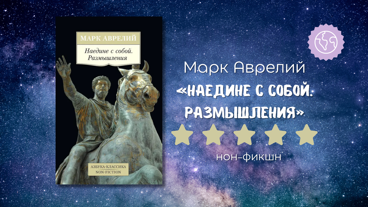 Это та книга, которая может стать настоящим наставником для многих читателей. Она способна заменить всех этих новомодных коучей. Может оказать помощь тревожным людям в принятии довольно простых истин. Поможет сохранять стойкость и спокойствие в трудных жизненных ситуациях. Поможет научиться управлять собственными эмоциями. Мудрость, глубина и философия осознанности - всё это вы найдёте в трактате Марка Аврелия. Безусловно с этой книгой не стоит торопиться и читать её лучше весьма дозированно. Она требует сосредоточенности и 100% внимания - иначе не будет смысла вообще за неё браться. Каждое из высказываний нужно осмыслить и пронести через себя. Что-то будет очень близко, с чем-то можно не согласиться, а что-то и вовсе не понять (на данном жизненном этапе). Но не зря этот сборник афоризмов, написанный ещё во II веке н.э., сохранился до наших времён. Он по сей день актуален и может быть полезен каждому, кто решиться потратить своё время на его изучение. Римский император из династии Анто