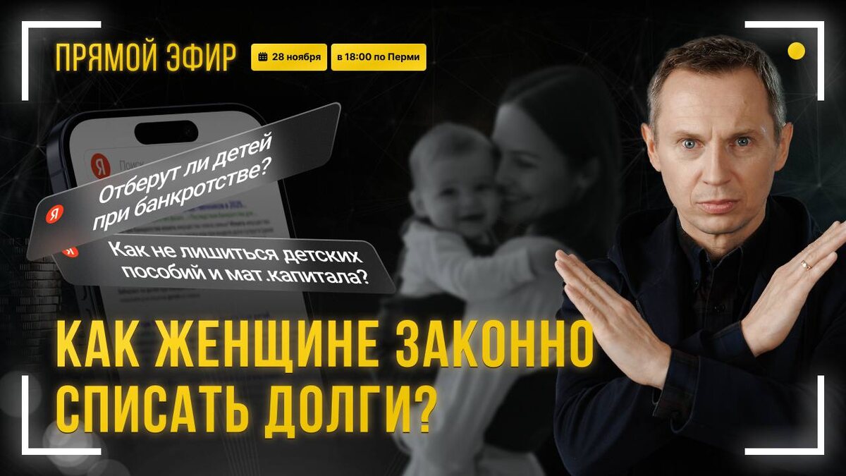 🔥 ПРЯМОЙ ЭФИР уже сегодня! Друзья, всех жду сегодня в 18:00 на эфире «Как женщине законно списать долги?» Больше половины наших клиентов — женщины, которые несут на себе кредиты семьи, долги после развода, отсутствие алиментов и микрозаймы. Я считаю своим долгом рассказать, как можно законно освободиться от кредитного рабства и вернуть спокойствие в жизнь. О чём поговорим: ✅ какие долги реально списать; ✅ почему женщинам часто проще пройти процедуру; ✅ что будет с жильём, пособиями и личными вещами; ✅ может ли опека забрать ребёнка; ✅ пошагово: от бесплатной консультации до полного списания долгов. ❗️ВАЖНО: в связи со сбоями эфиров в Telegram, мы проведём трансляцию на площадке Яндекс Телемост. Ссылка на трансляцию: https://telemost.360.yandex.ru/live/ac062c7aacc44e53b4efabe06e3f262a
