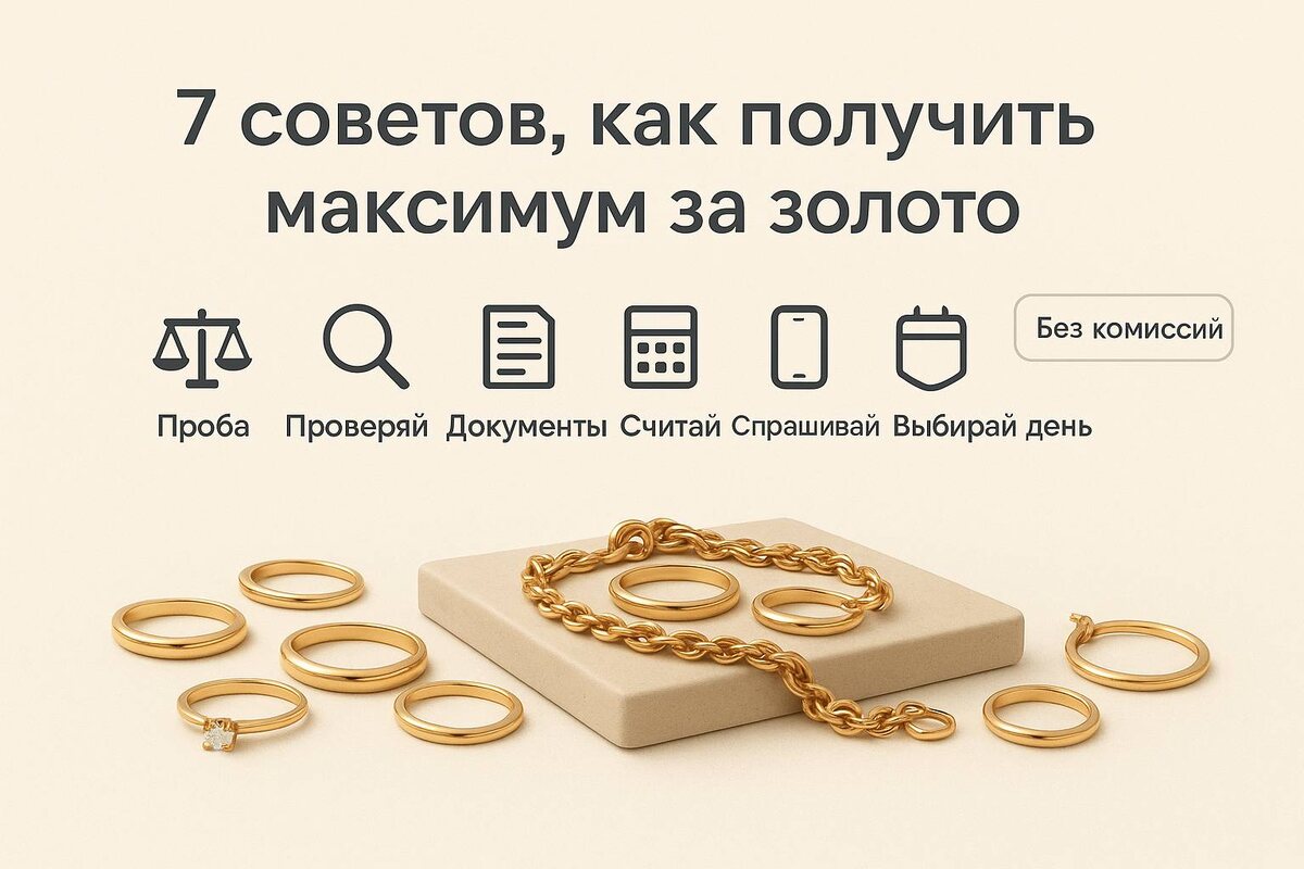 💡 Зачем читать Если вы собираетесь сдать золото — важно не терять в цене на ровном месте. Ниже — семь практичных советов, которые помогут подготовиться, избежать скрытых минусов и получить больше денег честно и быстро. 🔍 1) Сравните предложения — но выбирайте надёжных Узнайте текущие условия в 2–3 местах. Смотрите не только на «цифру за грамм», но и на репутацию, отзывы, отсутствие скрытых комиссий, прозрачность расчёта. Надёжный ломбард прямо объясняет, из чего складывается цена, и закрепляет условия до сделки. ⏱️ 2) Не затягивайте — продать можно выгодно уже сейчас Цена на металл меняется. Если вы ждёте «идеального дня», легко упустить текущую высокую цену. Планируете траты к праздникам или важные платежи? Лучше обменять «мёртвые» украшения на реальные деньги вовремя. 🧾 3) Подготовьте информацию о изделиях Проверьте пробу и клейма (583/585/750 и т. д.). Если сохранились бирки/чеки — возьмите с собой: это повышает доверие и ускоряет оценку. Для брендовых изделий отметьте марку и
