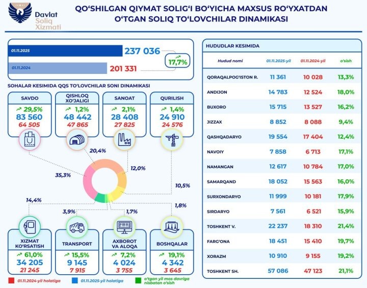 В пресс-службе Налогового комитета Республики Узбекистан сообщили, что по состоянию на 1 ноября 2025 года число поставленных на специальный регистрационный учет плательщиков налога на добавленную стоимость (НДС) составило 237 036. По сравнению с аналогичной датой прошлого года данный показатель увеличился на 17,7 процента, что свидетельствует о расширении круга хозяйствующих субъектов, работающих в формате, предусматривающем уплату НДС и применение установленных требований налогового законодательства.