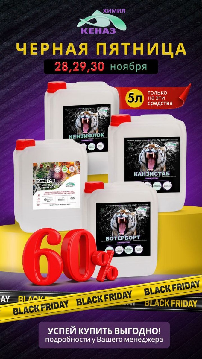 Уважаемые партнёры! Рады сообщить о запуске специальной акции в честь Чёрной Пятницы! ⚡3 дня супер-скидок⚡ — только пятница, суббота и воскресенье! В рамках акции вы можете приобрести следующие позиции со скидкой 60%: • Вотерборт — 5 л • Кензифлок — 5 л • Канзиcтаб — 5 л • КЕНАЗ Сложные загрязнения — 5 л Условия акции: Оплата должна поступить в пятницу, субботу или воскресенье. Подробности участия уточняйте у вашего менеджера. +7 (495) 728-38-38 info@kenazgroup.ru Не упустите возможность пополнить запасы по выгодной стоимости! — только три дня: 28, 29 и 30 ноября!