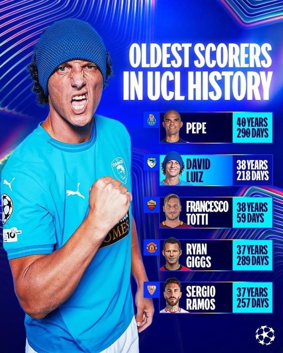 Давид Луис стал вторым самым возрастным игроком в истории Лиги Чемпионов, когда-либо забивавшим в этом турнире