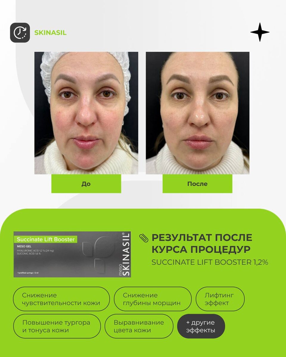 Идеальное решение для обезвоженной, склонной к небольшим отёкам и воспалениям кожи – SKINASIL®Succinate Lift Booster 1,2%. После прохождения курса ваши пациенты получат: ✓ Снижение глубины морщин, повышение тургора и тонуса кожи;