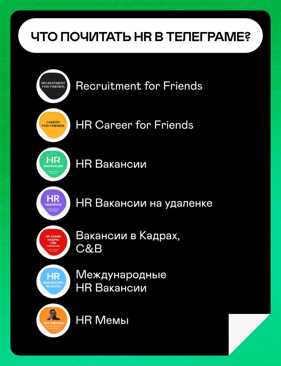 Что почитать HR в телеграме? Собрали подборку каналов и чатов для эйчаров и рекрутеров: 😩 Recruitment for Friends Обзоры зарплат по всему миру, чек-листы и свежие исследования для HR. 😩 HR Career for Friends Канал о построении карьеры в корпорации и на фрилансе. Здесь можно найти вакансии в HR: 😩 HR Вакансии Сфера HR: подбор и адаптация, партнёрство, обучение, развитие, оценка и другие. 😩 HR Вакансии на удаленке Только удалённые вакансии в подборе и адаптации, партнерстве, обучении, развитии, оценке, КДП, C&B и другие. 😩 Вакансии в Кадрах, C&B Сфера КДП, компенсаций и льгот, аналитики, организационного дизайна, HR-аналитики, Total Rewards. 😩 Международные HR Вакансии HR позиции с локацией в Европе, LATAM, США, в других частях мира и на удалёнке. Здесь можно найти работу за границей. И, конечно, мемы на рабочие темы: 😩 HR Мемы Ежедневно свежие видео мемы про работу, подбор и корпорации.