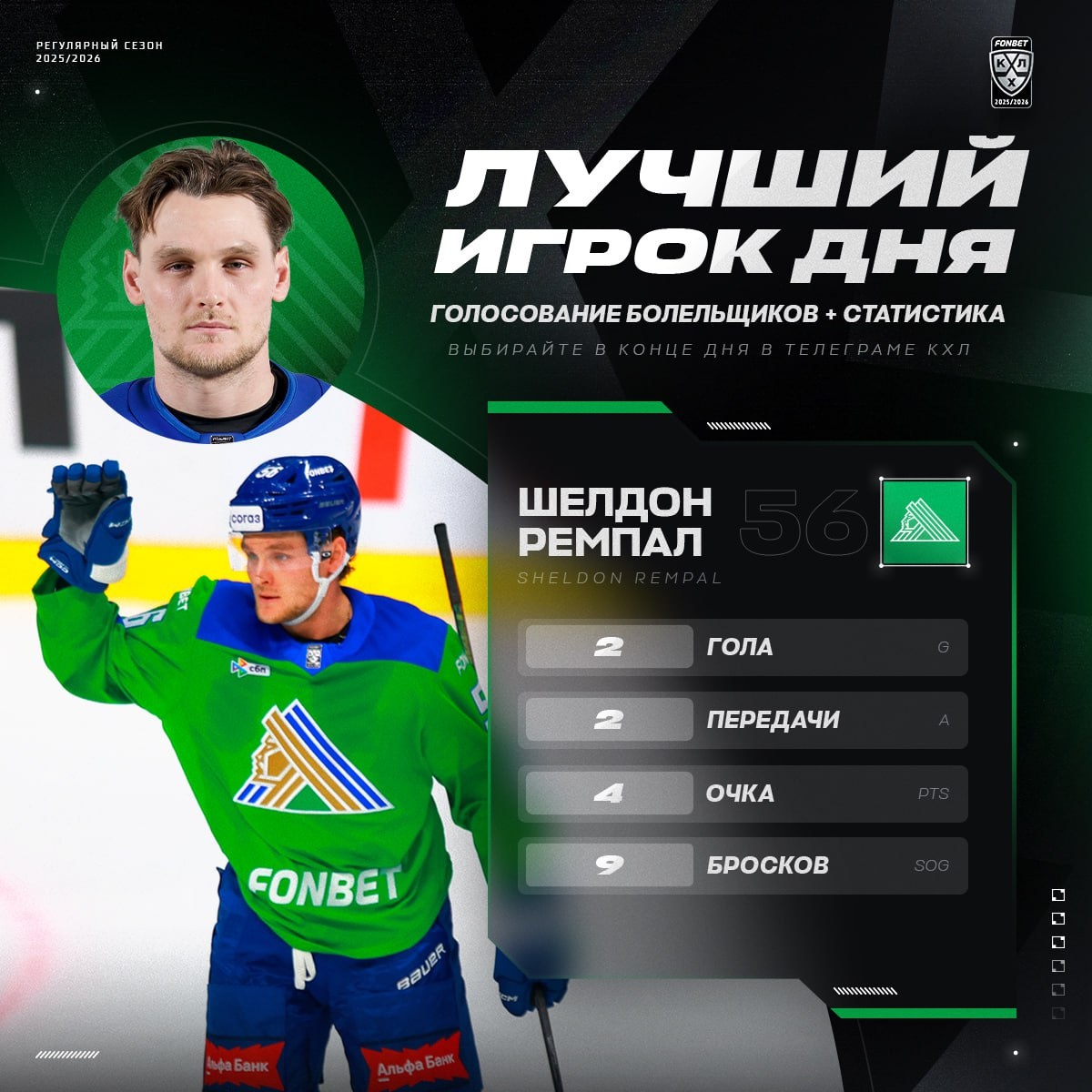 💚 Пара шайб, пара передач — так и получилась вторая в карьере Шелдона Ремпала 4-очковая игра.