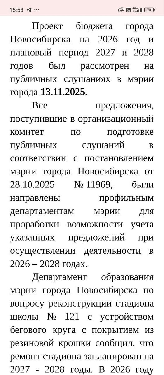 Послесловия публичных слушаний по бюджету 18+ НАСТОЯЩИЙ МАТЕРИАЛ (ИНФОРМАЦИЯ) ПРОИЗВЕДЁН, РАСПРОСТРАНЕН И (ИЛИ) НАПРАВЛЕН ИНОСТРАННЫМ АГЕНТОМ КАВЕРЗИНОЙ СВЕТЛАНОЙ ВИКТОРОВНОЙ ЛИБО КАСАЕТСЯ ДЕЯТЕЛЬНОСТИ ИНОСТРАННОГО АГЕНТА КАВЕРЗИНОЙ СВЕТЛАНЫ ВИКТОРОВНЫ* * номер в списке Минюста 777 Ответили пока только по беговому кругу стадиона школы 121. И, кажется, они в годах запутались. Будем надеяться, что речь про 2026, а не 2027 год Созвонилась. Нет, всё верно - 2027. В 2026 будут спортзал ремонтировать, там с потолком проблема