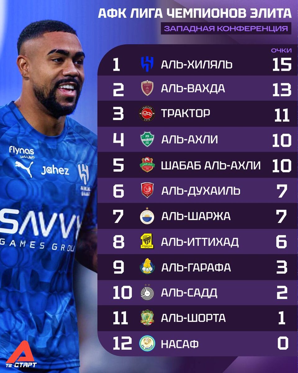 💁🏻♂️ Такие расклады в группах АЛЧ «Шанхай Шеньхуа» Слуцкого опустился на предпоследнее место, «Аль-Хиляль» идет без единой осечки, а «Кобе» лидирует на Востоке. Напомним, в плей-офф выйдут по 8 лучших команд из каждой конференции. Впереди — самое интересное! 🔥 Подписывайся на ТВ СТАРТ в MAX📲