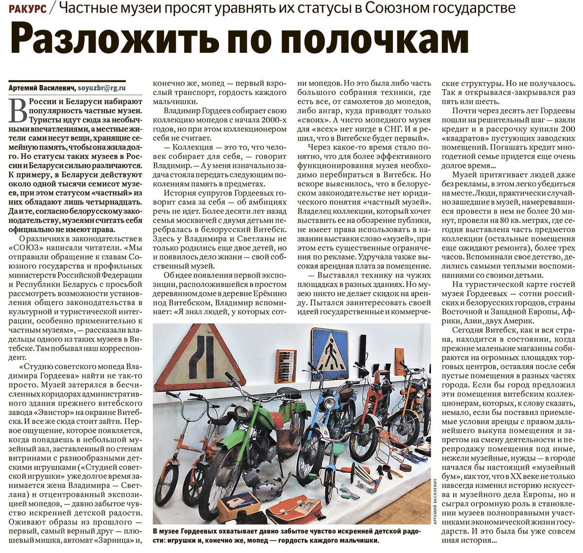Сегодня в газете "Союз. Беларусь - Россия - федеральный выпуск" вышел материал по нашему письму. Мы направили обращения не только в различные СМИ, но и в министерства и Беларуси, и России. И, в том числе, обратились к Президентам Республики Беларусь и Российской Федерации. На данный момент Министерство культуры Республики Беларусь предлагает нам провести временную выставку в Витебске. Но проблема гораздо глубже. Существующее в Республике Беларусь законодательство по музеям писалось почти 10 лет назад и совершенно не учитывает изменившуюся ситуацию. Достаточно сказать, что в этом году турпоток в рамках Союзного государства вырос до 6 миллионов человек. А это значит, что в ближайшее время в Беларусь за год будет приезжать сопоставимый с населением Республики поток туристов. И едут эти люди именно за новыми впечатлениями. Которые, в том числе, дают и частные музеи. Поэтому, чем раньше законодательство начнёт учитывать новую туристическую ситуацию, тем больше туристов получат от Республики