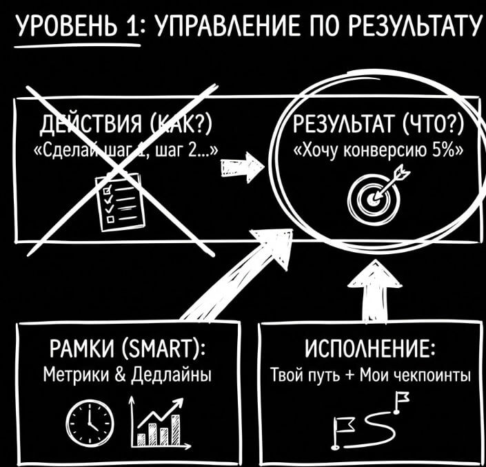 Задачи для 1: управление по результату Уровень 1 - это когда человек уже умеет работать без пошаговой инструкции, но ещё не всегда видит всю систему целиком. Здесь я переключаюсь с "как делать" на "что должно получиться". Как выглядит постановка задачи для уровня 1: 1. Описываю результат, а не действия Не "сделай 5 писем в рассылку", а: "Нужно довести конверсию в оплату с 3 % до 5 % за счёт цепочки писем. Критерий успеха - стабильные цифры в течение 2 недель". 2. Договариваемся о метриках и дедлайнах "Смотрим на такие-то отчёты, первая контрольная точка в среду, финальный результат в пятницу". 3. Отдаю человеку право выбрать путь Я прямо говорю: "Как именно ты до этого дойдёшь - твоя зона. Твоя задача - приносить мне честные статусы и вовремя поднимать флаги, если что-то идёт не так". 4. Контроль по ключевым вехам Не лезу в каждый шаг, но жёстко держу точки контроля, которые мы заранее согласовали. SMART здесь наконец начинает работать нормально: человек уже в состоянии держать