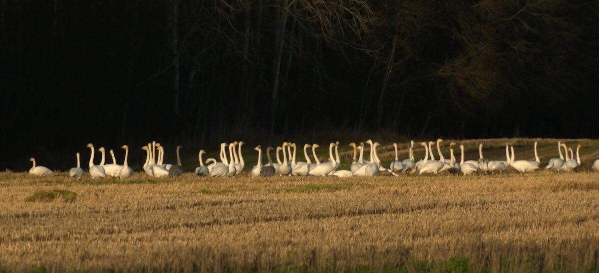 На одном из полей в Ленобласти скопилось около полутысячи лебедей