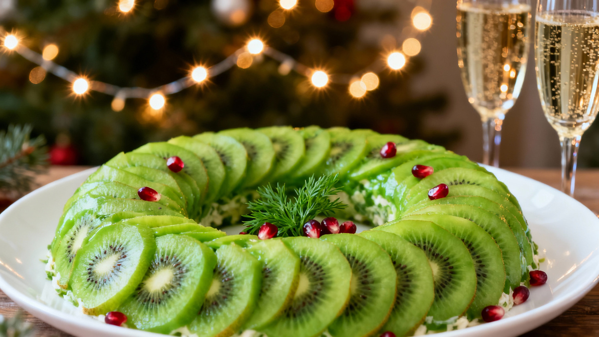 Здравствуйте, дорогие друзья! Каждый год в преддверии праздников мы ломаем голову: какой бы такой новогодний салат приготовить, чтобы он был и красивым, и вкусным, и оригинальным? Чтобы гости ахнули от восторга и сразу потянулись за добавкой? Если вы устали от классики и ищете что-то действительно впечатляющее, у меня для вас есть настоящая находка — салат “Изумрудный браслет”. Это не просто салат, это съедобное украшение для вашего праздничного стола! Он выглядит роскошно, как драгоценность, а сочетание нежной курицы, пикантного сыра, сладковатого киви и хрустящих орехов — это просто гастрономический восторг. Поверьте, этот салат станет главным хитом вашего новогоднего меню! Секрет формы: Чтобы салат получился в виде кольца, нам понадобится плоское блюдо и стакан. Установите стакан в центр блюда — вокруг него мы и будем выкладывать слои. Теперь самое сложное: отправляем салат в холодильник минимум на 2-3 часа для пропитки. Перед самой подачей аккуратно вынимаем стакан из центра. Ваш р
