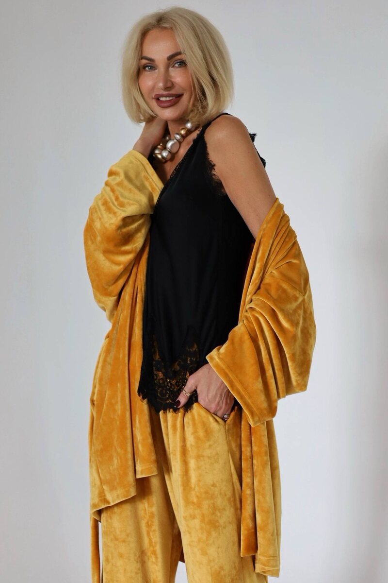 Велюровый костюм с кимоно и брюками палаццо — 6700₽ Размер: L Состав: 70% хлопок, 30% лайкра 📌Размерная сетка: Мерки велюрового костюма: Кимоно идёт в едином размере oversize, а брюки доступны в трёх стандартных размерах: M, L и XL, как и у наших велюровых костюмов. Кимоно: - Плечо: 29 - Рукав: 49 - Длина: 90 - Ширина полочки: 39 - Ширина спинки: 75 Брюки: - Размер M: - Длина: 106 - Резинка: 33-47 - Ширина к низу: 25 - Размер L: - Длина: 109 - Резинка: 35-53 - Ширина к низу: 28 - Размер XL: - Длина: 112 - Резинка: 37-59 - Ширина к низу: 31 На модели размер: L Параметры: 96/68/96 / 182 Пишите нашему менеджеру @Matrosova (+79022237939)