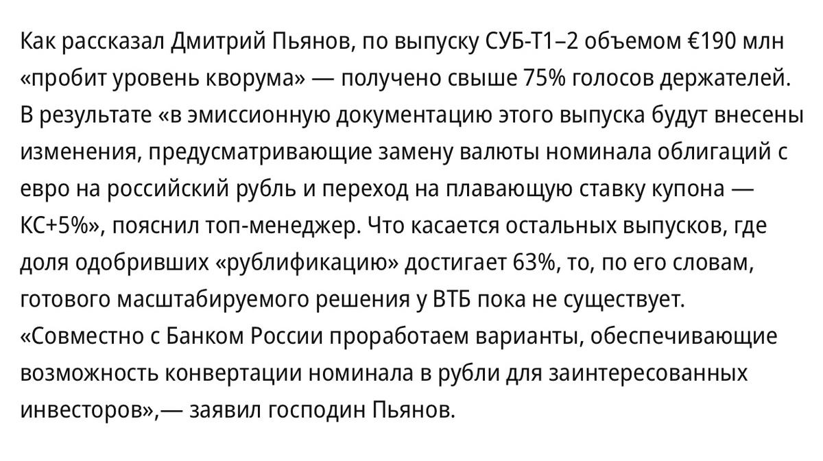 Денис Габдуллин же из БКС договорился, что котировки субордов в случае рублификации даже вырастут до номинала.