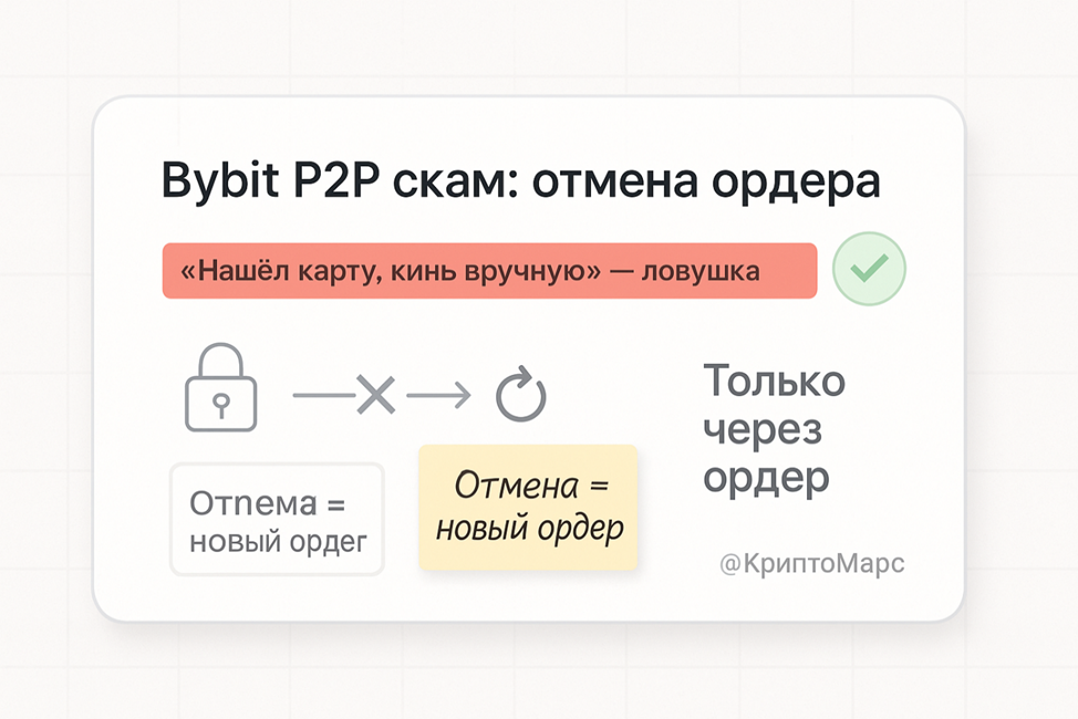 Иногда на P2P можно встретить схему, построенную не на технической уязвимости, а на попытке сыграть на доверии, спешке и страхе упустить выгодный обмен. Она простая, но отлично работает на тех, кто хочет закончить сделку быстрее, чем думает. Разберём ситуацию, чтобы понимать механику и не попасться. Вы покупаете USDT. Открываете ордер → ждёте реквизиты → продавец тянет время. Затем в чате начинается привычная «драма»: Ордер отменяется. Всё выглядит как обычная ситуация — ничего необычного. Через несколько минут продавец пишет: «Нашёл карту, могу принять деньги, перекидывай». Параллельно он открывает апелляцию по уже отменённому ордеру. Он давит на эмоции, создаёт ощущение, что проблема решилась. Но за это время он уже вывел USDT с биржи. Если вы переводите деньги на карту вручную — сделки для биржи больше не существует, эскроу нет, защиты нет, крипты нет. Именно в этот момент и происходит обман. Чтобы потерять деньги в этой схеме, достаточно сделать одно действие после отмены ордера. К