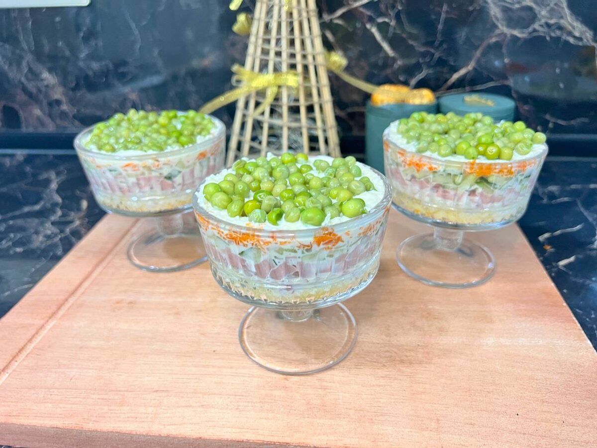 Всем привет! Новый год уже совсем близко, продолжаем к нему готовиться. Сегодня приготовим наш любимый салат оливье в креманках слоями. Подготавливаем все необходимые ингредиенты и приступаем.
