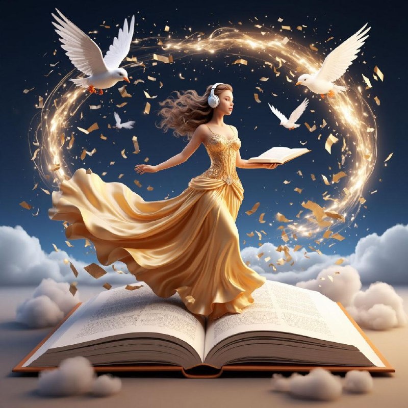 🧚♀️ Ночная фея electric discharges, flashes, swirling notes, woman in flowing golden dress with long train made of stars, wearing headphones and walking on clouds, flying ethereal creatures, 3D illustration on the surface of book pages Что думаете? 🔥 — Круто! 😨 — Ну такое... #AI Делитесь своими промтами в комментариях🙉 Подписаться. Midjourney, SORA & DALL: IT, Нейросети