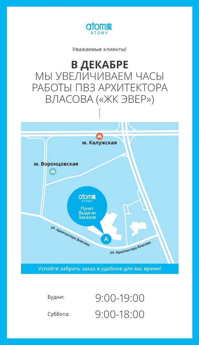 Дорогие атомианцы🩵 Обратите внимание на изменение графика работы ПВЗ АРХИТЕКТОРА ВЛАСОВА в декабре