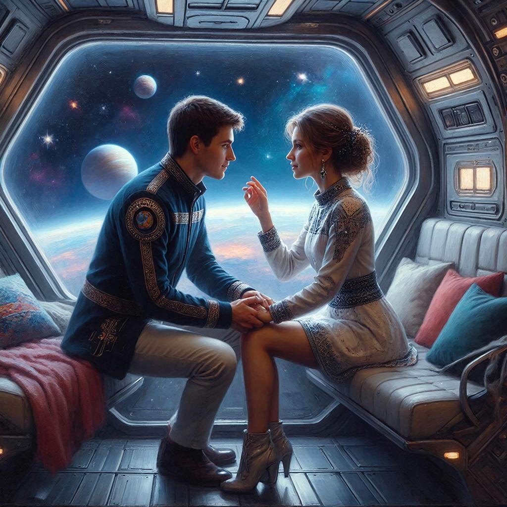 Они смотрели друг другу в глаза, забывая обо всем остальном мире. Этот момент стал началом их любви, преодолевающей границы галактик и культур.