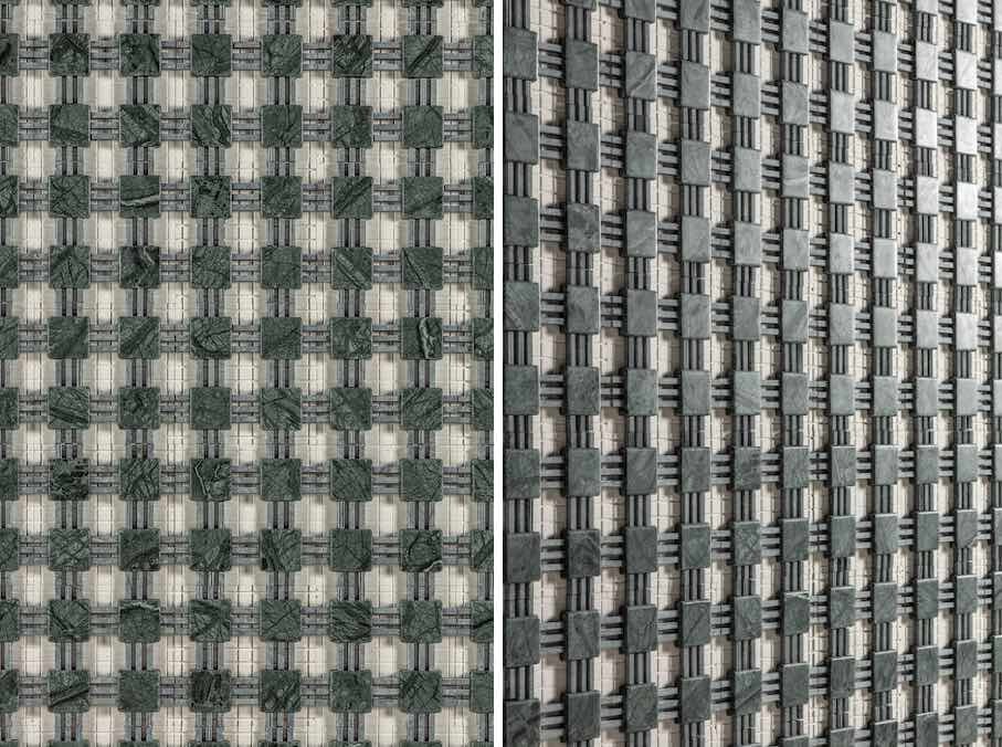 «Ткань одевает человеческое тело, а мрамор одевает пространство», — утверждает итальянская компания Lithea, и вместе с дизайнером Еленой Сальмистраро они превратили это в нечто великолепное: четыре плитки из новой коллекции «Pattern Tessili» (Образцы тканей) вдохновлены узорами тартан и чехлами диванов Честерфилд и превращаются в трехмерную настенную плитку. Lithea базируется в столице Сицилии, Мессине, и до сих пор сосредоточила свои коллекции на средиземноморском дизайне. Студия Елены Сальмистраро находится в Милане, экономическом мегаполисе. Для создания плитки используются различные виды мрамора, обработанные вручную. Вдохновением послужил текстиль с цветными нитями, создающий геометрические узоры. Елена Сальмистраро превратила их в инкрустации или мозаики (20x20x2 см), поверхности которых имеют трёхмерное изображение. «Каменные ткани» поражают не только своим особым характером, но и прожилками, которые невозможно обнаружить в текстиле, их пришлось бы отнести к дефектам машинного т