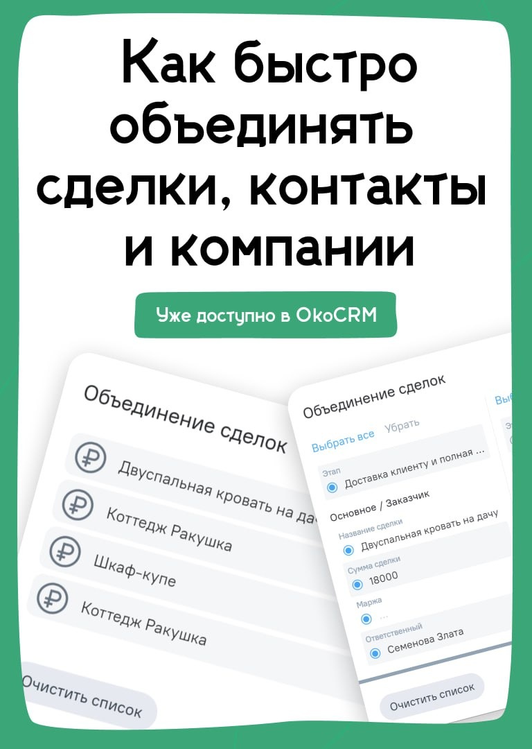 В OkoCRM появилось объединение сделок, контактов и компаний 🔥 👯♂️Если у вас в базе живут Иван, Иван Петров, Иван Петров (Питер_СВ) и ещё три его цифровых брата — теперь это не проблема. OkoCRM научилась объединять дубли карточек без особых сложностей. Теперь, если один клиент оставит две заявки на разные номера или менеджер создаст сразу две сделки вместо одной, вы легко сможете объединить их — и избавиться от дублей. Как их объединять — рассказали в карточках 👆 📌 А ещё подготовили подробную инструкцию в Базе знаний → Проверьте свою базу: вдруг там давно пора навести порядок 😉