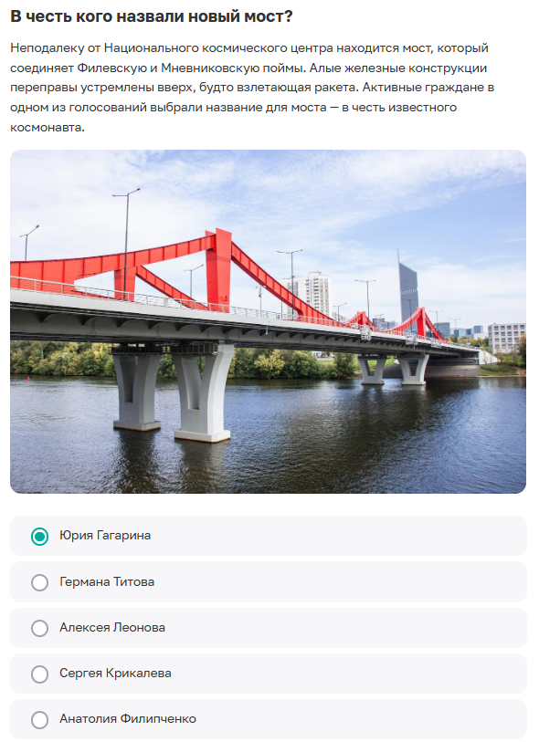 Сама викторина. "Активный гражданин" начисляет 40 баллов за указание правильных ответов викторины. Уникальность Парящего моста не только в V-образной форме, но и в инженерном решении. У него нет ни одной опоры в русле реки. Конструкция удерживается мощными консолями, закрепленными на берегу, что и создает полный эффект "парения" над водой. Фигурный мост не просто переправа, а парадные въездные ворота в усадьбу, стилизованные под старинную крепость. Его гротескные формы и стрельчатые арки были новаторством для русской архитектуры XVIII века и служили "прелюдией" к сказочному облику всего царицынского ансамбля. Деревянный Всехсвятский мост, построенный в 1692 году, был настоящим инженерным чудом своего времени. Он стоял на "быках", это такие опоры из свай, заполненных камнем, и имел подъемный механизм для пропуска высоких судов. Его стоимость была так велика, что и родилась поговорка "Дороже каменного моста". Крымский мост - единственный в Москве подвесной мост, но его уникальност