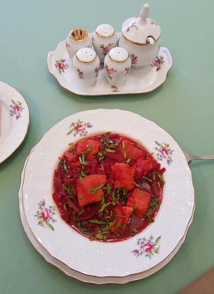 Добрый день, дорогие друзья! В очередной раз обещают в Сибири понижение температуры ниже -30, и поэтому я предлагаю приготовить горячее, яркое, ароматное, согревающее блюдо, в состав которого входит всего 4 основных ингредиента. Для приготовления 8 порций нам понадобятся: 1 килограмм свиного окорока, 600 грамм свеклы, 400 грамм репчатого лука, 500 грамм свекольного кваса, 2 чайные ложки соли, 30 грамм муки, 30 грамм подсолнечного масла, 20 грамм листьев петрушки. Приготовление: свинину нарезать кубиком. Лук нарезать четвертинками колец, свёклу нарезать соломкой. Муку высыпать в полиэтиленовый пакет, добавить часть свинины и перемешать. Разогреть сковороду с растительным маслом, выложить кусочки свинины. Обжарить на среднем огне со всех сторон до золотистого цвета. Свинину обжаривать небольшими партиями. Обжаренную свинину выложить в кастрюлю с толстым дном, посолить. Добавить репчатый лук. Добавить квас, довести до кипения, уменьшить огонь до среднего уровня, накрыть к