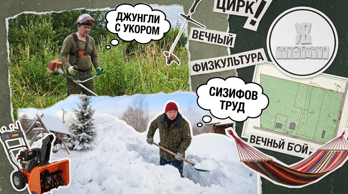 Всем Саморучкам и им сочувствующим, большой Привет! Боже правый, ну что это за бесконечный цирк с конями! Только в прошлые выходные потратил полдня на покос — приезжаю через неделю, а там уже новые джунгли, которые смотрят на меня с таким наглым видом, мол: «Ну что, хозяин, опять припёрся? Мы тут без тебя новое поколение вырастили, давай, работай!». И ведь самое обидное — знаю, что это вечный бой, знаю, что через семь дней всё начнется сначала, но будто заколдованный, снова и снова выхожу на эту тропу войны. А зимой — это отдельный вид безумия! Помню, в прошлом году в воскресенье вечером уезжал таким довольным: всё расчищено, дорожки ровненькие, машина стоит как принцесса на идеально убранной парковке. Приезжаю в пятницу — а там сугробы по пояс! Чувствую себя тем самым Сизифом из древнегреческих мифов, только вместо камня у меня бесконечный снег и вездесущая трава. И ведь снег этот падает как будто специально, назло — только расчистишь, а на утро уже новая порция. Мои владения —
