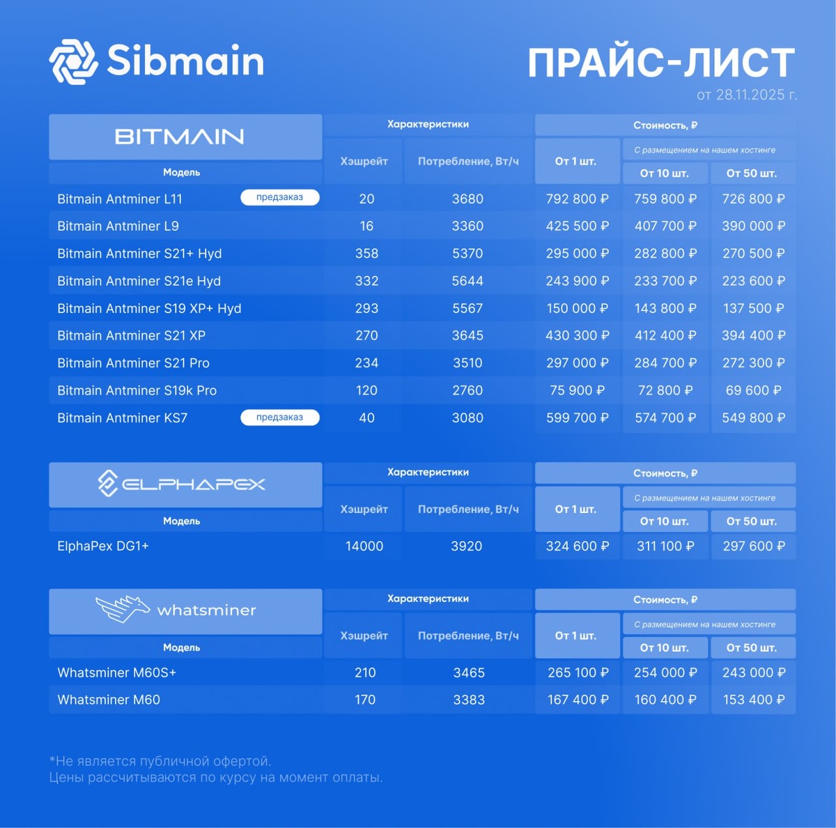💲Актуальный прайс-лист на 28.11. Sibmain комплексные решения для майнинга под ключ! - Поставки майнинг оборудования - Дата-центр в Красноярске 80 МВт - Размещение от 5,4 руб/кВтч ⌨️ Нужна консультация или помощь в подборе оборудования? Звоните: +7(937)544-44-43 📍 г. Москва Калужская площадь д.1 к.1 💬 WhatsApp 💬 @Sibmain_salesbot 🌐 sibmain.ru