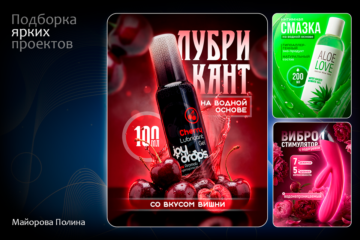 Вишневый лубрикант — это дерзкая история. Контраст черного и красного, сочные брызги и крупные ягоды. Дизайн получился «вкусным», насыщенным и динамичным