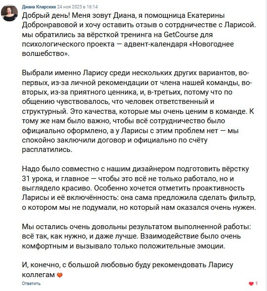 Отзыв такой прекрасный по моей работе получила. Спешу поделиться 🤍