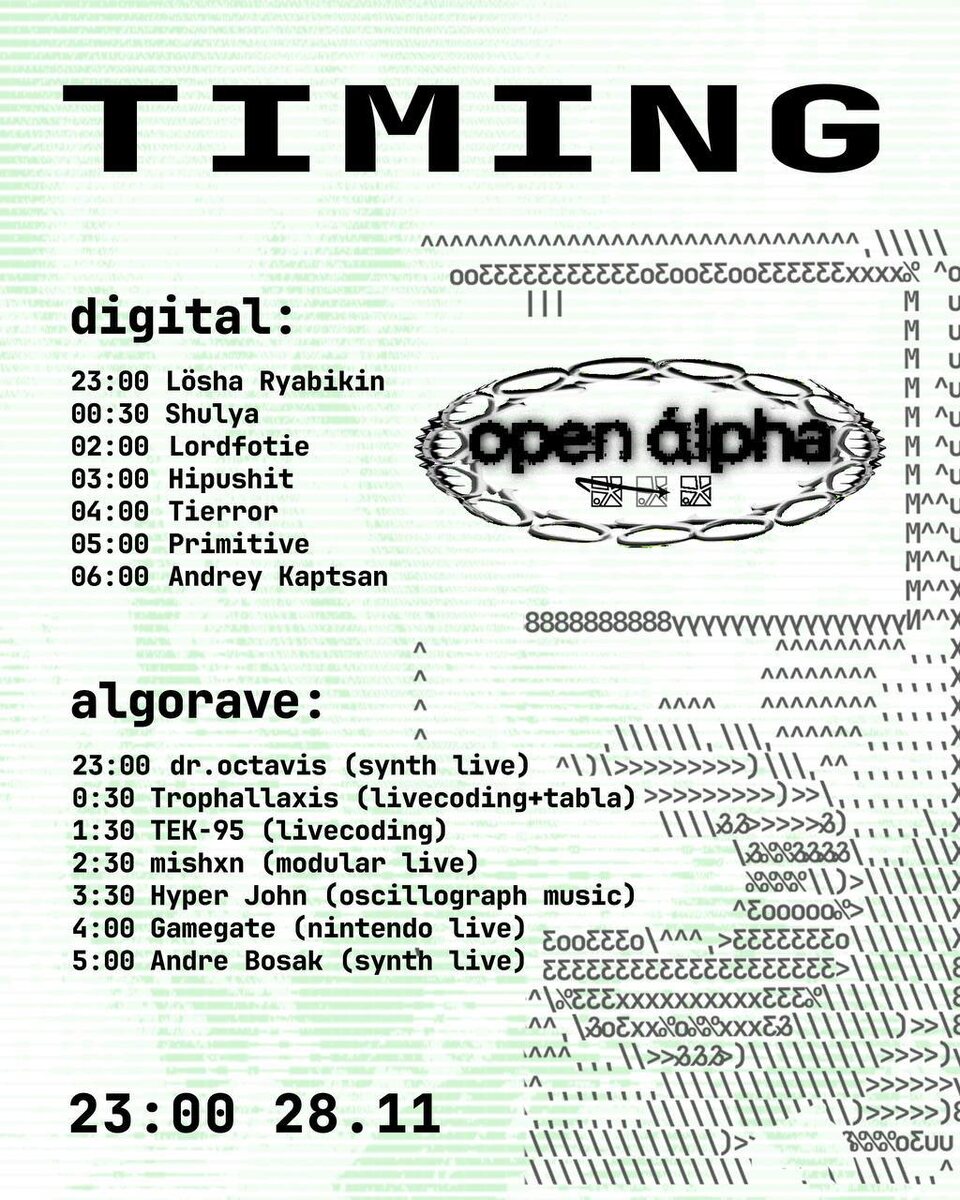 🖼 Тайминги события ЛУЧ’ х Open Alpha на картинке. Советуем приходить пораньше чтобы ничего не пропустить. А так же участвуйте в конкурсе Результаты в 18:00 🎫 Билеты Закрытие продаж в 22:00 На входе дороже. 📆 28 ноября, в 23:00 📍Blank, Санкт-Петербург, Арсенальная наб.1